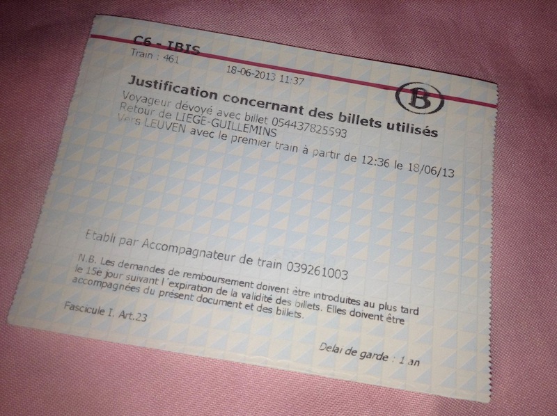 フランス語で書かれた紙を後で必死で解読した所、Liege12:36発の電車に有効、みたいなこと書いてある。